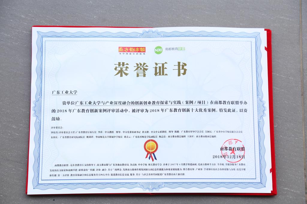 本网讯 12月18日,南方都市报南都教育联盟举行“2018教育年会暨广东教育创新十大优秀案例致敬分享会”,揭晓了2018年广东教育创新十大优秀案例。我校的《与产业深度融合的创新创业教育探索与实践》在44个教育创新案例中脱颖而出,入选广东省教育创新十大优秀案例。