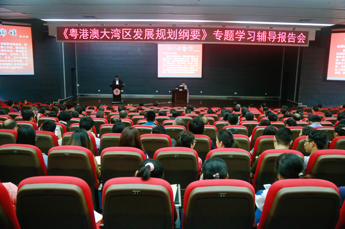 本网讯 3月29日上午,为深入学习宣传贯彻习近平总书记关于粤港澳大湾区建设重要论述和《粤港澳大湾区发展规划纲要》精神,切实把思想和行动统一到党中央和省委省政府对推进粤港澳大湾区建设的部署要求上来,学校在大学城校区大讲堂中心报告厅召开《粤港澳大湾区发展规划纲要》专题辅导报告暨党委中心组学习(扩大)会。会议邀请省委宣传部副部长、《粤港澳大湾区发展规划纲要》省委宣讲团成员杜新山作《粤港澳大湾区发展规划纲要》专题辅导报告,学校党委书记陈新主持报告会。