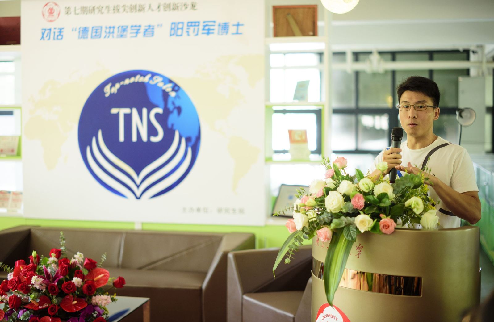 本网讯 5月16日,第七期研究生拔尖创新人才创新沙龙(TNS)顺利举行。“让优秀成为习惯,让榜样成为力量”,本期沙龙活动邀请到“德国洪堡基金”获得者阳罚军博士做客创新沙龙,与研究生拔尖创新人才分享研学经验和感受。学校副校长、研究生院院长张光宇教授、研究生院常务副院长吴福根教授应邀出席了本次活动,近60名“研究生拔尖创新人才”培育对象参与。