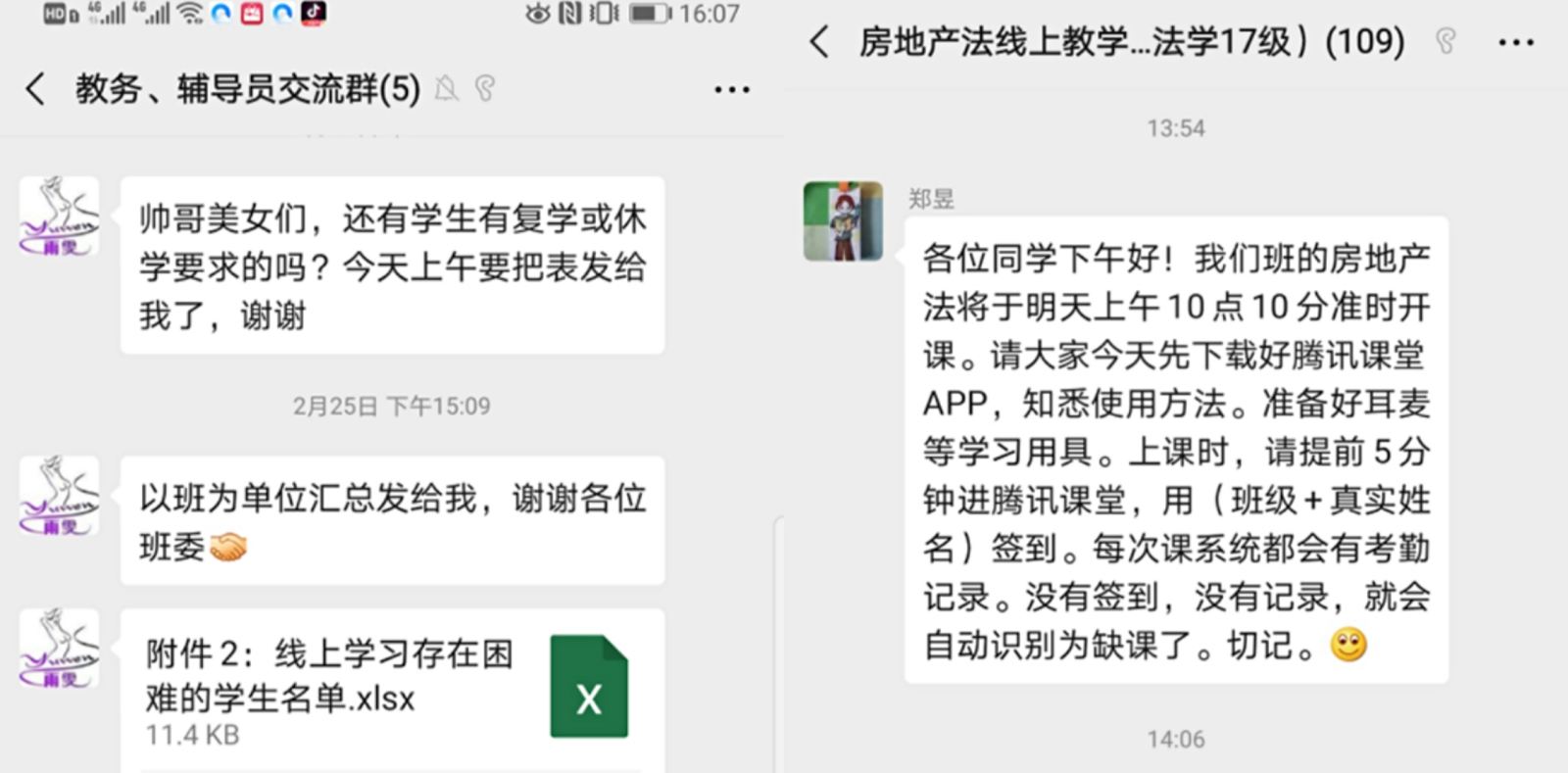 特殊时期,政法学院学生工作进行纵横交错、点面结合的网格化管理。通过“学院——年级——班级——宿舍”(纵向)和“学生干部群——党支部群——心理“小天使”群——重点人员关爱群——教务群”(横向)的工作网络,“定岗定责”,实时掌握学生动向,特别是疫情多发地区学生的活动轨迹,及时进行信息摸排、健康打卡、汇总报告和关爱帮扶,构筑起群防群治的严密防线。