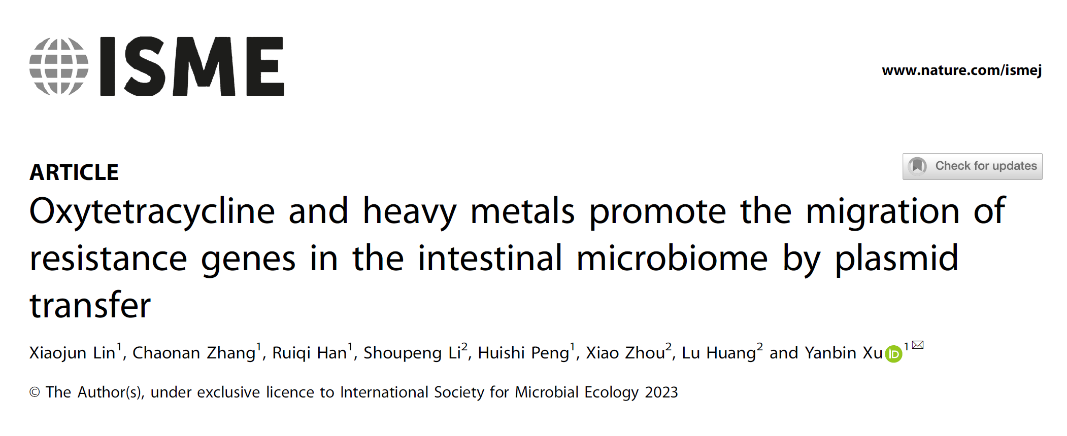 我校环境科学与工程学院许燕滨教授团队的最新研究成果“Oxytetracycline and heavy metals promote the migration of resistance genes in the intestinal microbiome by plasmid transfer”在Nature子刊、环境领域TOP期刊《The Isme Journal》上发表。该期刊近五年影响因子为12.300,CiteScore为20.40。环亚手机版登录入口为第一完成单位,许燕滨教授为通讯作者,博士研究生林晓君为第一作者,论文DOI: 10.1038/s41396-023-01514-w,学校分析测试中心提供测试服务。