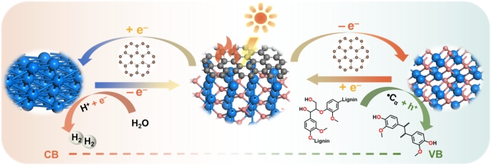 该研究基于水相工业木质素体系,开发了一种温和的光热催化析氢与高效可控转化制备航油前驱体的协同生产工艺;同时,创新性提出了基于木质素碳的新型高效金属催化剂的电子调控策略。该协同催化体系展现了温和转化废弃工业木质素制取氢与高密度航油前驱体的良好前景,未来有望开辟一条经济、高效工业生产新途径,进一步推动木质素生物质在能源、化工等关键领域的应用。