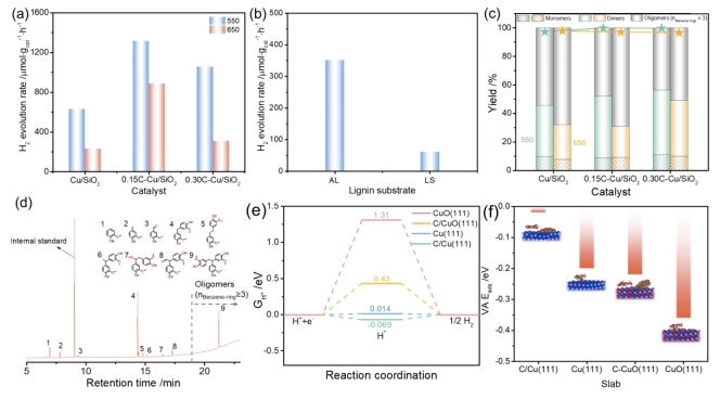 该研究聚焦于水相木质素高效转化过程,借助木质素碳辅助设计新型动态Cu基催化体系,实现了光热催化还原析氢与可控氧化转化制备航油前驱体的高效偶联转化。该过程巧妙地利用了活性热解后木质素碳独特的活性基团结构及其电子缓冲特性,成功在催化剂表面同步构建了富电子Cu0和缺电子Cuσ+(1<σ≤2)中心。并紧密结合水相木质素还原与氧化转化过程对催化剂表面化学环境的需求,通过表面修饰木质素碳层的电子缓冲作用,精确调控以上Cu相关活性物相的价态分布,显著提升光热催化还原与氧化反应活性,实现了氢气与航油序列前驱体低聚态酚类产物的高效生产。在200 ℃、模拟太阳光照射的条件下,当使用木质素单体衍生物(香草醇)作为空穴牺牲剂时,C-Cu/SiO2催化剂达到最高析氢活性为1313.9 μmol·gcat-1·h-1,相比Cu/SiO2提升2倍以上,达到当前非贵金属光催化析氢的领先水平。同时,木质素及其单体模型化合物被可控氧化偶联生成航空煤油序列前驱体,C13 ~ C16芳香二聚体产率高达45.2%。