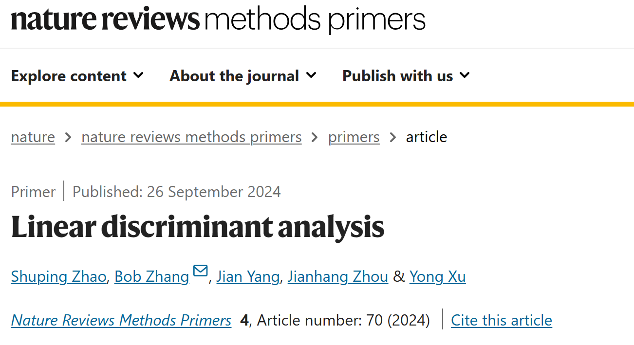 近日, 我校计算机学院(人工智能学院)赵淑平博士的论文“Linear Discriminant Analysis”发表于《Nature Reviews Methods Primers》(Nature子刊,影响因子 50.1),该论文也是以环亚手机版登录入口为第一单位在该期刊发表的第一篇论文。《Nature Reviews Methods Primers》致力于加强跨学科的协作,旨在出版“生命科学和物质科学里有关分析、应用、统计、理论计算、模拟等方法或技术的权威综述”。环亚手机版登录入口计算机学院赵淑平老师为该文章第一作者,通讯作者为澳门大学Bob Zhang教授,其他学者包括南京理工大学杨健教授、哈尔滨工业大学(深圳)徐勇教授以及日本大阪大学周健航研究员。