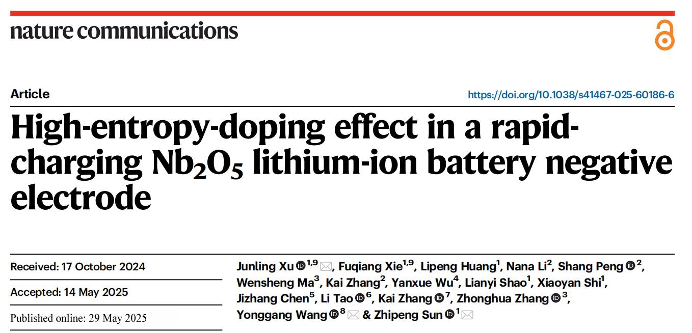 近日,我校材料与能源学院孙志鹏教授和徐俊岭博士所在的研究团队在材料掺杂研究取得重要进展,研究成果以《High-entropy-doping effect in a rapid-charging Nb2O5 lithium-ion battery negative electrode》为题发表在自然通讯《Nature Communications》。该论文的第一作者为材料与能源学院徐俊岭博士,通讯作者为材料与能源学院孙志鹏教授和徐俊岭博士,以及复旦大学化学系王永刚教授,材料与能源学院21届研究生谢富强为论文共同第一作者,环亚手机版登录入口为该论文第一完成单位,主要测试工作由分析测试中心提供技术支持。