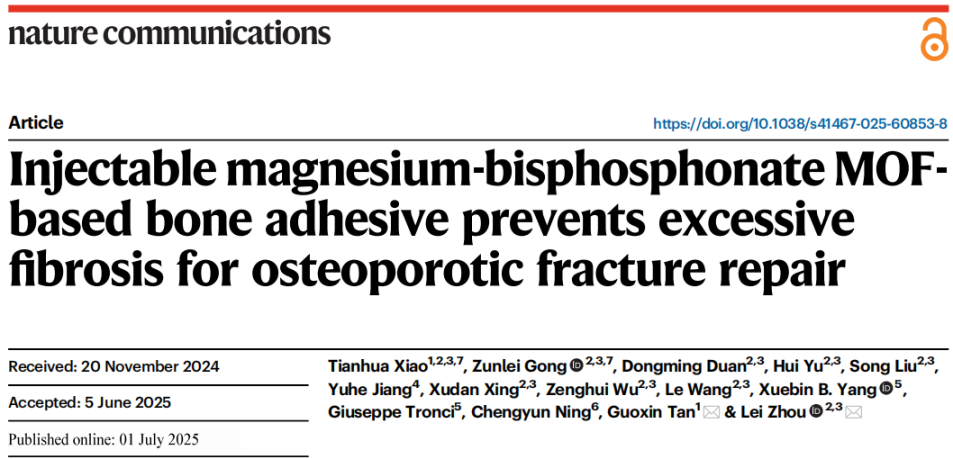 近日,我校轻工化工学院谭帼馨教授团队在骨质疏松性骨折修复研究中取得重要进展,研究成果以《Injectable magnesium-bisphosphonate MOF-based bone adhesive prevents excessive fibrosis for osteoporotic fracture repair》为题发表在自然通讯《Nature Communications》。该论文的第一作者为我校轻工化工学院肖天华博士生,通讯作者为我校轻工化工学院谭帼馨教授,广州医科大学附属第三医院周蕾研究员,广州医科大学附属第三医院巩尊磊博士后为论文共同第一作者,环亚手机版登录入口为该论文第一完成单位,主要测试工作由分析测试中心提供技术支持。