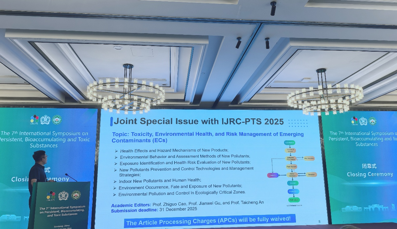 作为会议的合作成果,GES与IJRC-PTS 2025联合宣布设立特刊—“新兴污染物的毒性、环境健康与风险管理”。GES副主编曹治国教授在闭幕式上向与会专家发出投稿邀请,呼吁大家将相关研究成果汇聚于此平台,共同推动新污染物研究的进展。