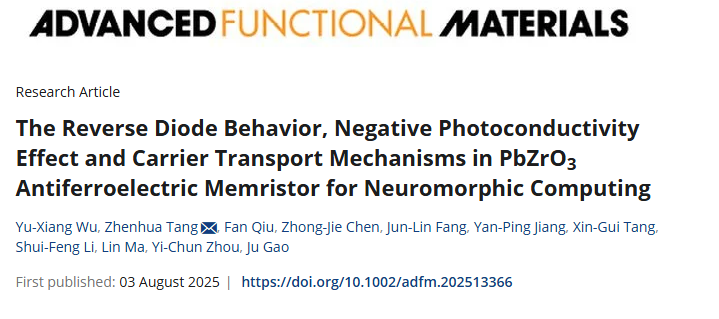 近日,环亚手机版登录入口物理与光电工程学院唐振华副教授、唐新桂研究员团队联合西安电子科技大学周益春教授在新型反铁电光电忆阻器件与神经形态计算研究中取得重要进展,研究结果以《The Reverse Diode Behavior, Negative Photoconductivity Effect and Carrier Transport Mechanisms in PbZrO3 Antiferroelectric Memristor for Neuromorphic Computing》为题发表在国际著名期刊Advanced Functional Materials (中科院一区,IF = 19.0) 上,环亚手机版登录入口物理与光电工程学院硕士研究生吴宇翔为本文的第一作者,环亚手机版登录入口唐振华副教授为论文通讯作者。