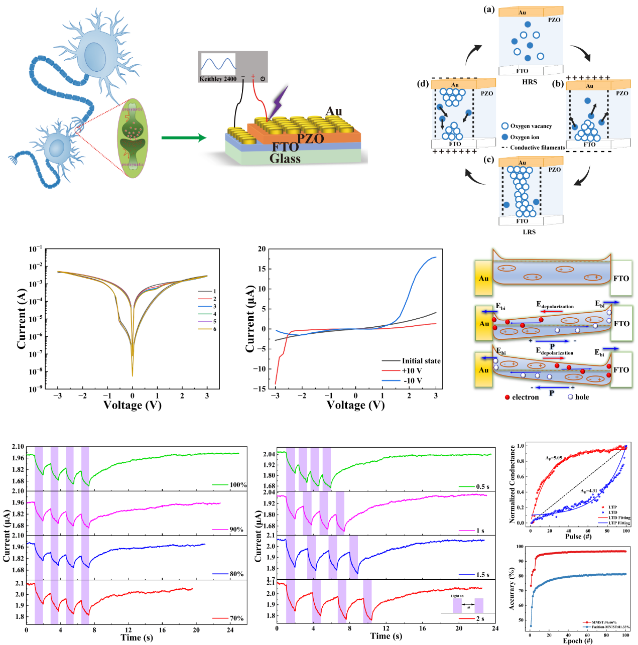作为模拟生物神经突触行为的关键器件,忆阻器在类脑计算、神经形态图像识别和低功耗存储等领域展现出广泛应用前景。本研究提出了一种基于PbZrO₃ (PZO)新型反铁电薄膜的光电忆阻器件,采用低温溶胶-凝胶工艺制备,构建了Au/PZO/FTO三层结构,具备良好的反铁电性能及阻变切换性能。通过极化诱导氧空位在器件界面间的不对称分布,实现了器件在正向与反向整流模式间的可逆切换;同时,归因于光生载流子在氧空位陷阱中的超快俘获,器件在紫外光照下表现出负光电导行为,具有快速而稳定的光电响应能力。
