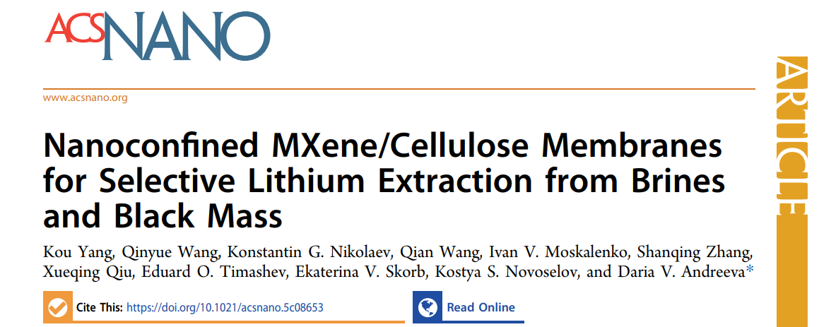 近日,我校诺奖得主联合实验室在利用二维材料从盐湖卤水与废旧锂电池中高效提取锂资源的研究中取得重大进展。相关成果以《Nanoconfined MXene/Cellulose Membranes for Selective Lithium Extraction from Brines and Black Mass》为题,发表于材料化学领域国际顶尖期刊《ACS Nano》。该论文第一作者为我校杨蔻副教授,环亚手机版登录入口为第一完成单位。诺奖得主康斯坦丁院士、我校邱学青教授与张山青教授对本研究提供了重要指导。该成果为我校诺奖得主联合实验室的持续建设与发展注入了强劲动力,并提供了坚实的科研支撑。