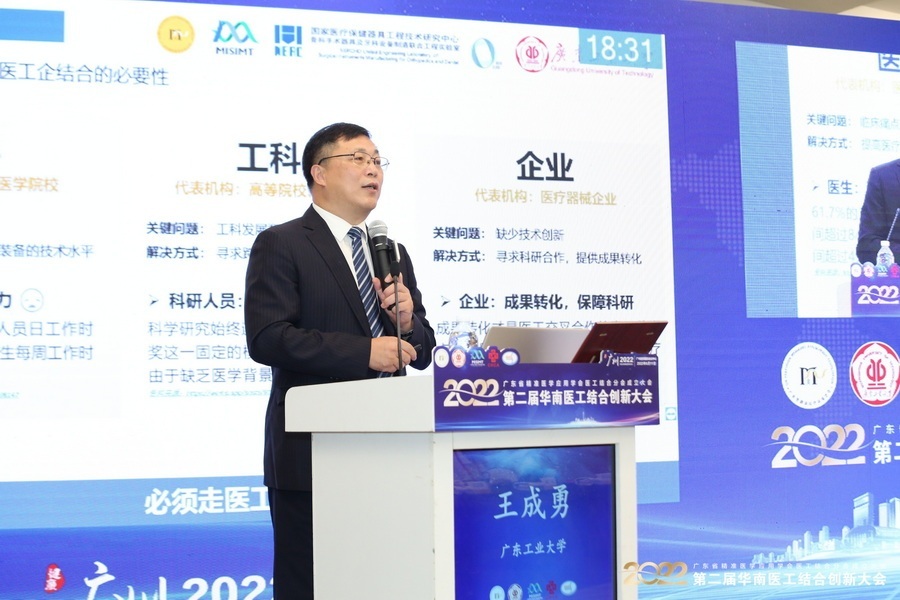 环亚手机版登录入口副校长、广东省精准医学应用学会医工结合分会主任委员、广东省微创手术器械设计与精密制造重点实验室主任王成勇教授,讲述了国家人民对于医工结合的迫切需求和医工结合的必要性,并列举了若干医工融合的案例。王成勇教授以政策给予医工融合的强大支持以及国内医疗器械市场的潜力为依据,阐述医工融合是未来发展的大趋势,是高校-医院-企业联合行动,保障人民生命健康的重要方向。王成勇教授还向大家介绍了MisIMT实验室医工融合的发展历程及科研成果。