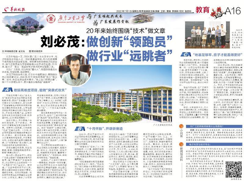 让刘必茂感到自豪的是,毕业多年,自己依旧将“团结、勤奋、求实、创新”的广工校训一以贯之。他坚信,选择新的赛道,服务于国家战略性新兴产业,前景无比广阔:“我们更希望推动着行业的创新发展,实际上一直履行着我们校训的内容。”(更多新闻资讯,请关注羊城派 pai.ycwb.com)