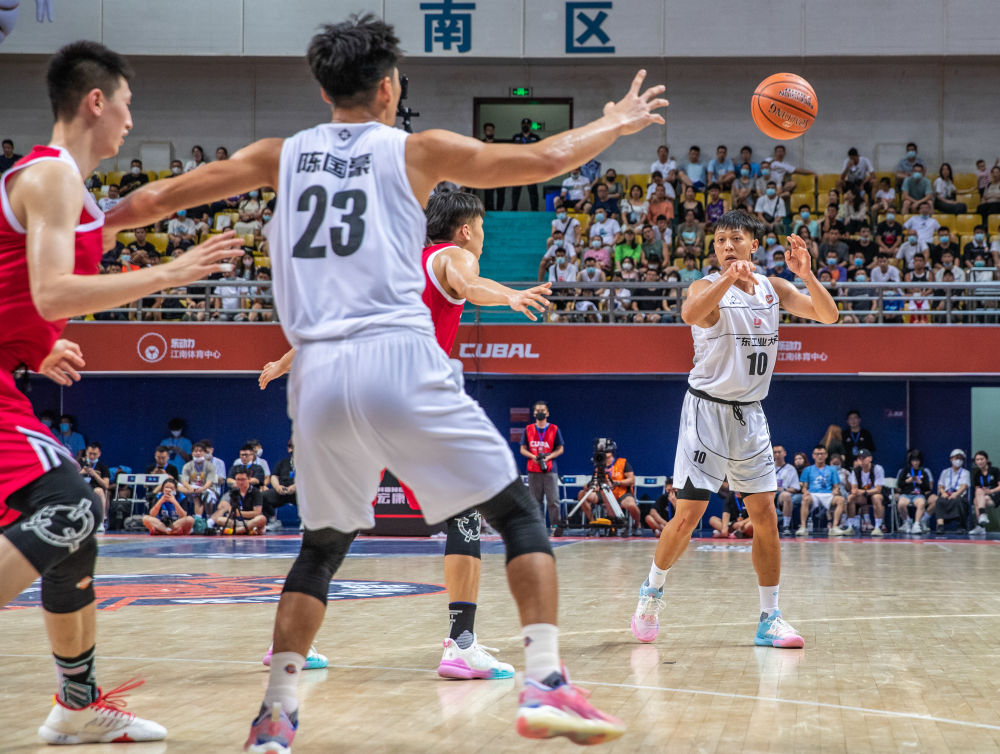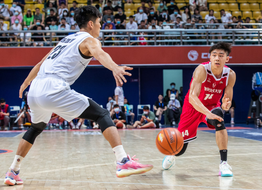 7月30日,西安交通大学队球员卢杜伟(右)在比赛中传球。新华社记者 黄伟 摄