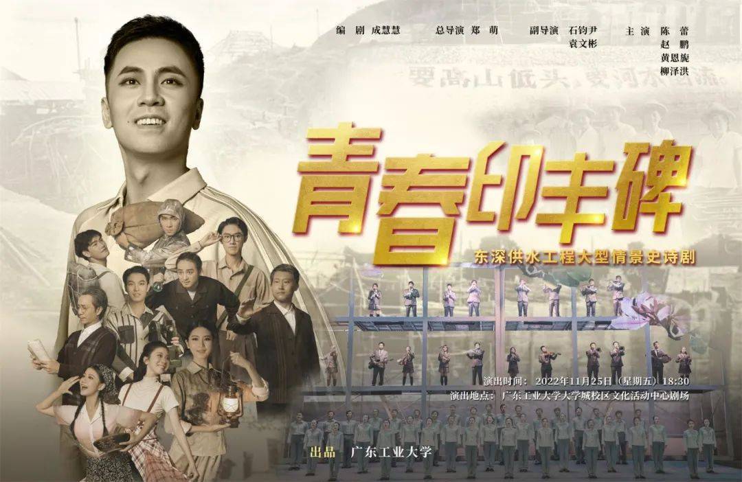 2022年初冬,一部赞颂广东水利人,致敬东深“时代楷模”,追忆东深“一代天骄”的原创大型情景史诗剧《青春印丰碑》,在环亚手机版登录入口内首演成功。这是一部由广工人主创、联合广东文艺界精心打造的原创情景史诗剧——广东省首部由在校师生为主体原创的大型情景史诗剧!广东省首次用舞台剧的形式讲述东深供水工程的历史故事!广东省高校首次以“时代楷模”精神传承为艺术主题在校园展演!