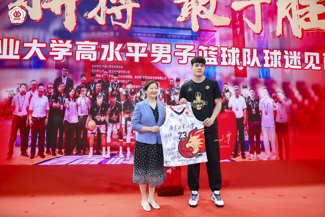 活动现场,球员代表陈国豪向学校赠送迎接本科办学65周年签名球衣,广工党委副书记朱蔚蔚代表学校接受球衣。