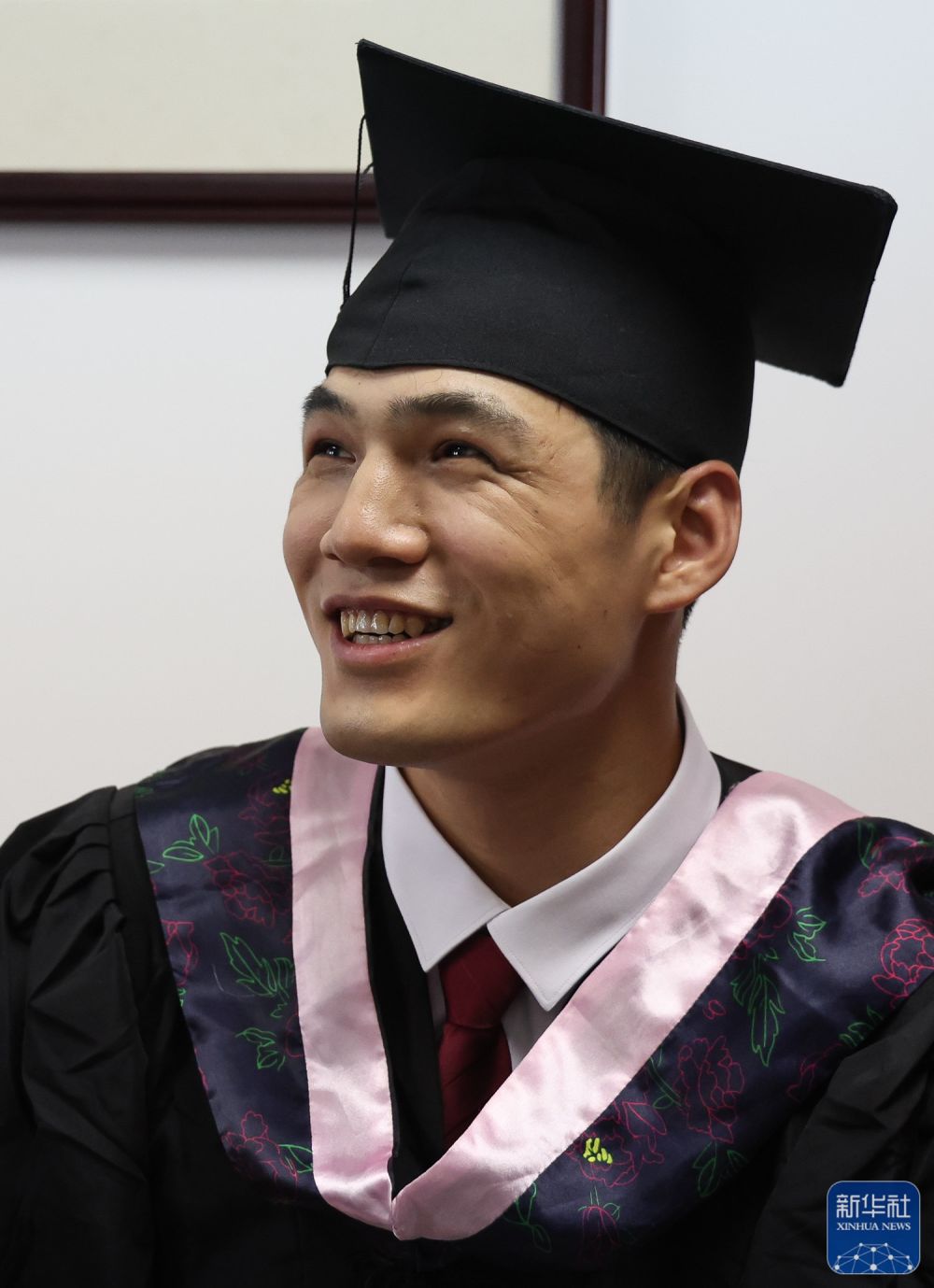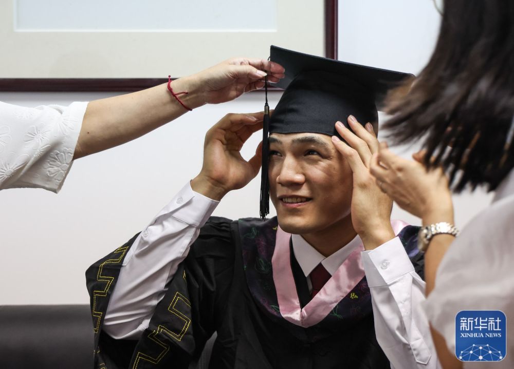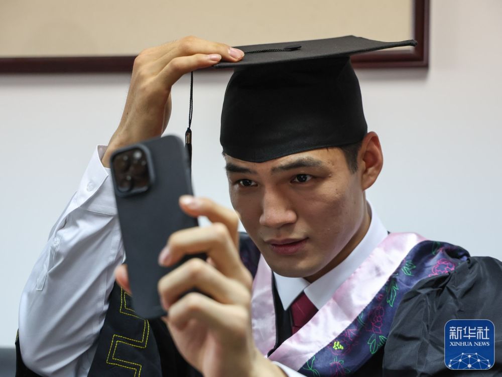 ↑6月28日,陈国豪整理学士帽准备参加学位授予仪式。