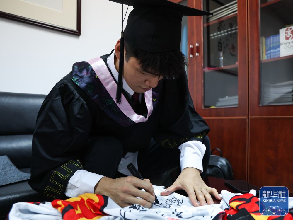 ↑6月28日,陈国豪在参加学位授予仪式前为球衣签名。