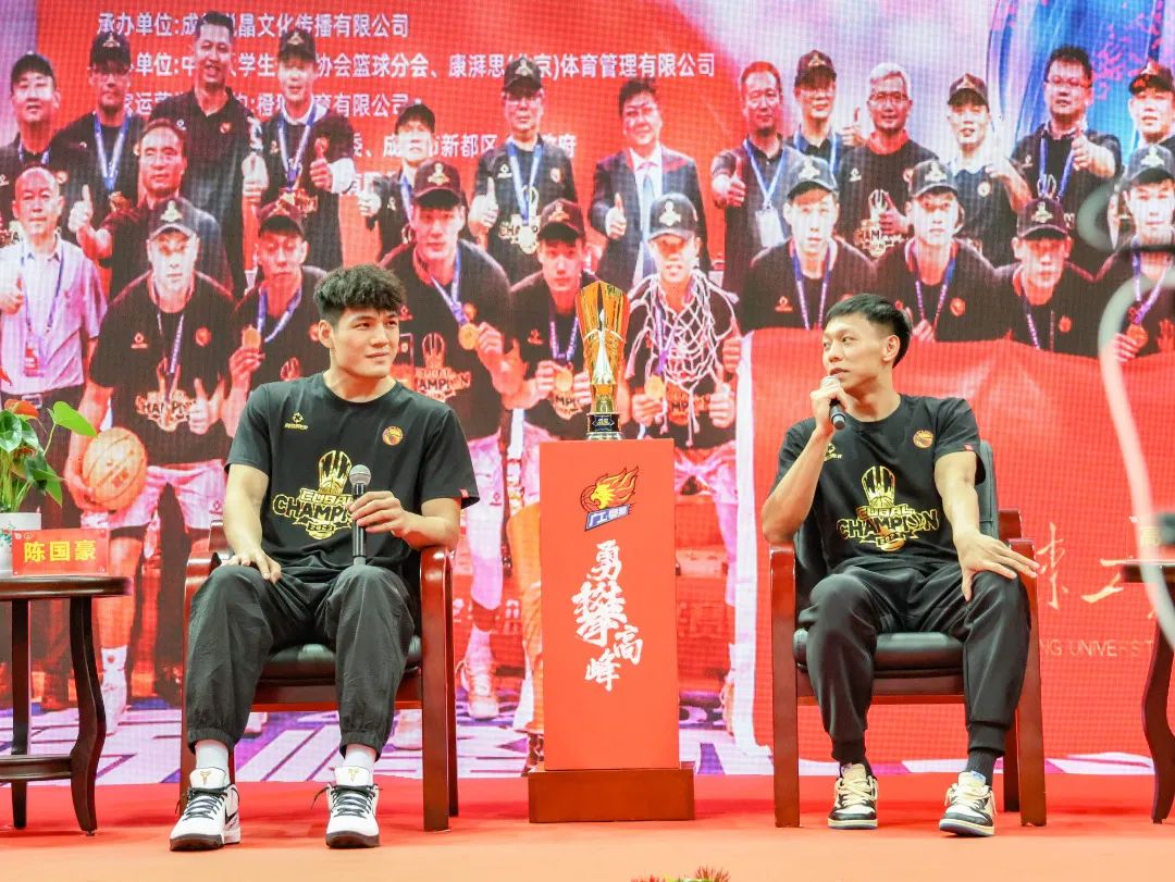 在球迷互动环节,主持人抛出一连串问题,引得现场呼声练练。主持人挑选出了总决赛中,抢断上篮、盖帽、投球等最精彩的四个瞬间,让现场同学从情绪、姿势和动作等方面模仿球员。广工学子们踊跃参与,在偶像面前“使出浑身解数”再现精彩瞬间。“国豪你觉得他们表现的咋样?”主持人问。“嗯,我觉得吧,比我的演技还是差了一点点。”陈国豪笑着说。