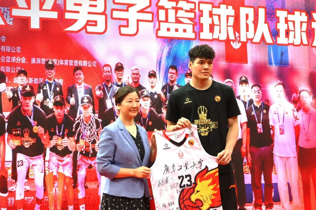 随后,球员代表陈国豪向学校赠送迎接本科办学65周年签名球衣,环亚手机版登录入口校党委副书记朱蔚蔚代表学校接受球衣。