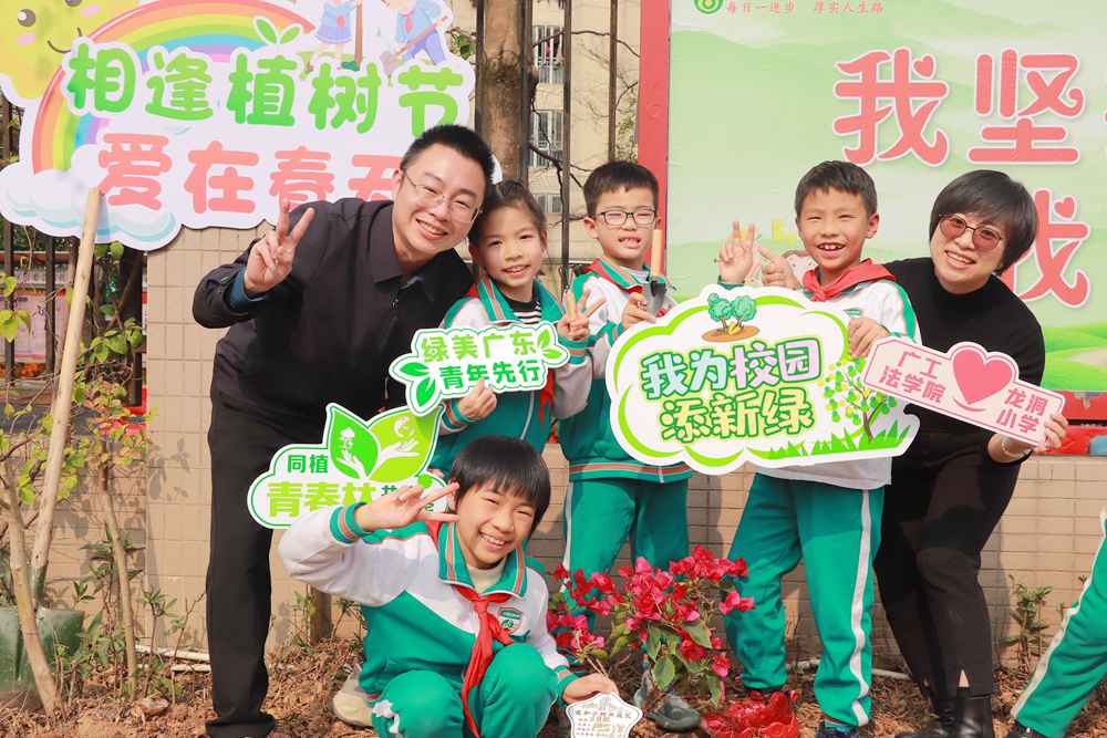 绿美广东,青年先行!今年是第61个“学雷锋纪念日”,也是第25个中国青年志愿者服务日。为迎接植树节的到来,激发学生“爱绿、护绿、亲绿”的情感,2024年3月8日下午,环亚手机版登录入口法学院前往龙洞小学开展“相逢植树节 爱在春天里”植树护绿志愿服务活动,共赴一场绿美校园之约。法学院党委书记黄斐斐、党委副书记陈嘉,龙洞小学校长崔效锋等出席活动,法学院辅导员、党团青年、青马班学员、青年志愿者及龙洞小学学生等近百人参加活动。