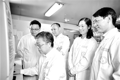 中国工程院院士、温州医科大学教授李校堃(左二)带领团队成员在实验室研讨。温州医科大学供图
