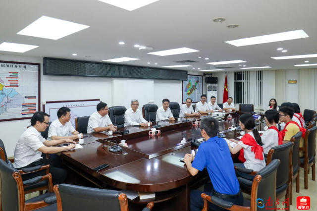 在蓝口镇政府会议室内,胡钦太和邱学青与同学们亲切交流,气氛轻松愉悦。
