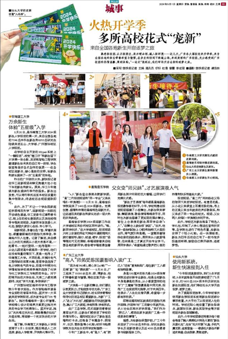 熟悉新校园、认识新朋友、展示硬本领、融入新环境……近几天,广东各大高校迎来开学季,来自全国各地的新生带着希望与憧憬,在亲友的陪同下跨越山海,来到美丽的广东校园,充分感受到广东校园的热情温馨、周到体贴。“一站式”报到后,他们即将开启全新的逐梦之旅。
