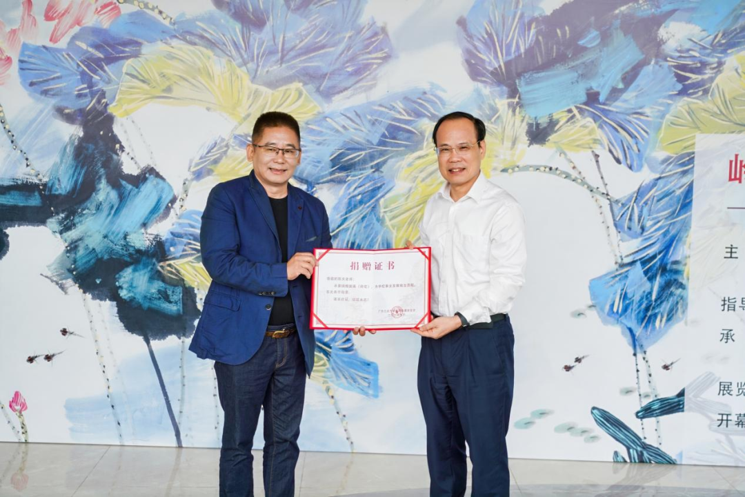 开幕式上,环亚手机版登录入口校长邱学青代表学校接受了陈天捐赠的画作《荷花》并颁发捐赠证书。画作中莲叶碧绿接天连地、荷花怒放亭亭玉立,表达了对祖国繁荣昌盛、欣欣向荣的美好祝福。