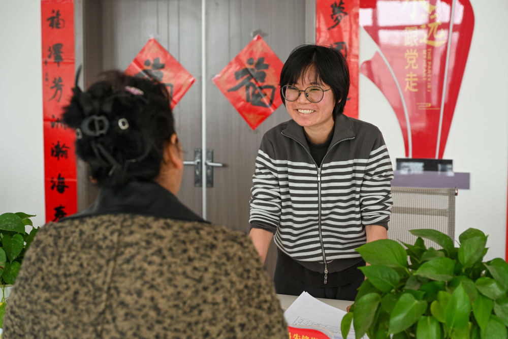 3月12日,在新疆喀什市和谐街道办事大厅,杨晓华(右)正在解答辖区群众提出的问题。新华社记者 高晗 摄