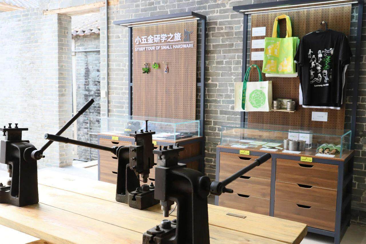 在当地政府和社区的支持下,师生团队深入梳理南沙社区发展脉络,以空间叙事的思路将展区分为“建村谋局-贺富佳话-万元群像-薪火相传-领航新篇”五大篇章,空间设计充分尊重祠堂原有格局,保留青砖墙面、木梁结构等传统元素;展陈设计则采用可活动落地展架,将照明系统集成于展架之上,避免对古建梁柱造成破坏。纪念馆中还设计了互动体验区,让参观者体验老式手啤机操作,亲身感受改革开放初期的劳动氛围。