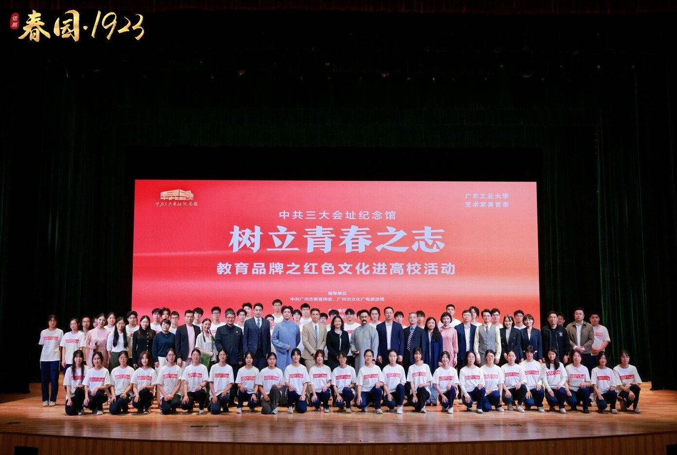 19时,红色短剧《春园·1923》在文化活动中心演艺厅拉开序幕。中共三大会址纪念馆副馆长李兴国、广工通识教育中心党总支书记黄华利为活动致辞。该剧原为中共三大召开100周年之际,由中共三大会址纪念馆联合广州市文学艺术创作研究院、广东省演出有限公司共同创排,以严谨的史实为基础,通过舞台艺术的感染力,再现1923年中共三大筹备与召开的历史场景。剧中,陈独秀、李大钊、毛泽东等早期共产党人追寻真理、胸怀理想的形象栩栩如生,演员们饱含深情的表演将观众带入那段风云激荡的岁月。
